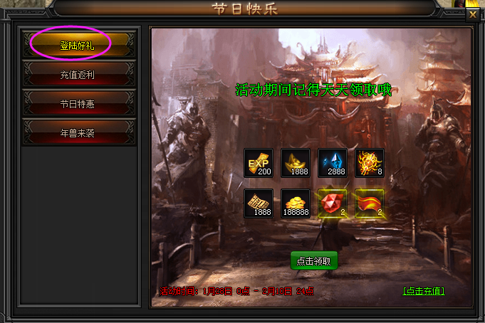 活动期间每天登陆游戏可在页面右上角”节日活动”处可领取登陆好礼。