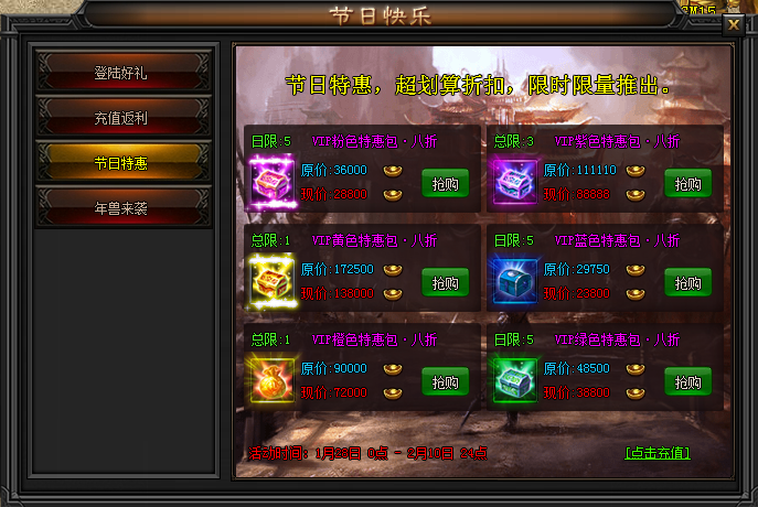 活动期间,超低折扣的活动礼包还同时间全面上架包括全力帮助您游戏更加舒畅开怀,可在页面右上角”节日活动”-节日特惠处购买特惠礼包,各种珍贵材料,道具限时出售,仅限活动期间购买,一定不要错过哦!