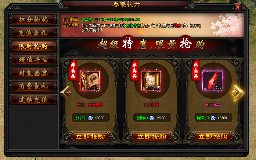 3.2. 活动期间内,每日可购买各种非卖品特惠礼包,每个礼包每日限购1次。