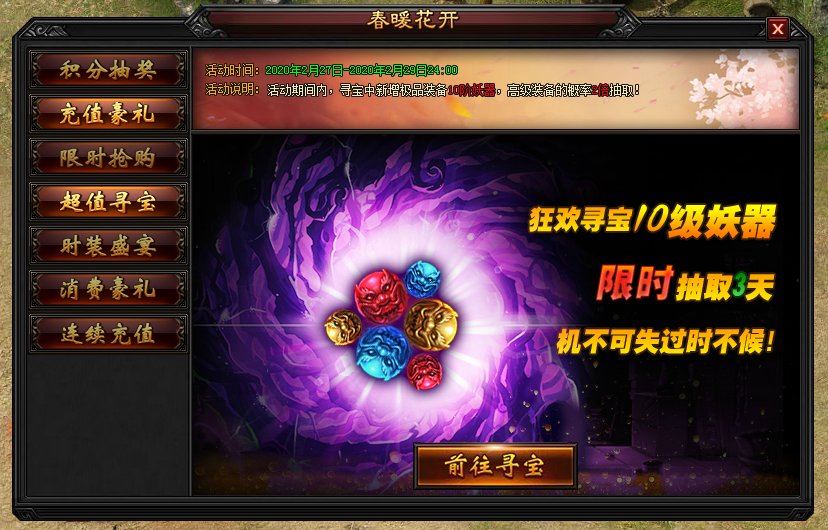 4.2 活动期间内,寻宝中新增屠魔装备,并且高级装备的概率双倍抽取