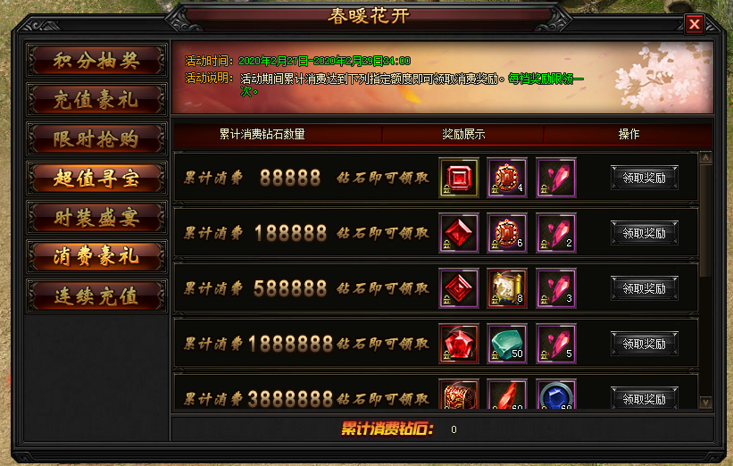 6.2 活动期间内,累计消费钻石达到固定数即可领取对应的奖励,每档奖励限领一次。