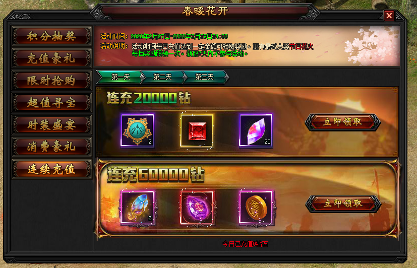 2.2 活动期间内,每日充值达指定钻石数额,即可领取充值奖励,可原每日充值奖励叠加领取