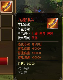 【活动内容】在活动期间,玩家充值都将获得对应的九鼎神兵(主角与武将专属武器,可依照主角与武将职业需求选择力量速度技巧神兵或者术法神兵,无等级限制可强化神兵等级,每个主角与武将只能佩戴一把九鼎神兵),每次充值只能领取一个订制九鼎神兵,玩家可在对应的九鼎神兵属性数值内(生命值,普通伤害,普通防御,法术防御,法术伤害,技能伤害,技能防御,暴击等级,韧性等级,命中等级,闪避等级,格挡等级,破击等级,必杀等级,守护等级)任选其三订制自己喜爱的属性值,其中普通伤害,普通防御,绝技伤害,绝技防御,法术伤害,法术防御,生命值可强化升级,其余属性为固定值,规则如下:
