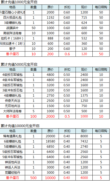 1、每日累计充值达到指定元宝可开启对应商店,充值金额越高,折扣越低;