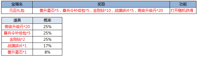 3、新增元旦礼包,活动期间通过每日活动战斗掉落获取,礼包内容为: