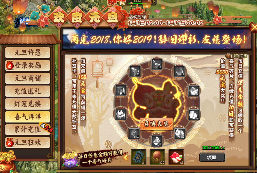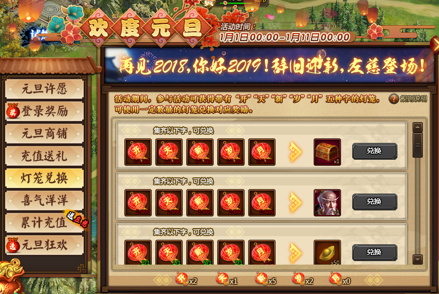 1、集齐一定数量的“开”、“天”、“新”、“岁”、“月”可兑换相应奖励。奖励兑换条件:(新增元宝和绑金兑换)