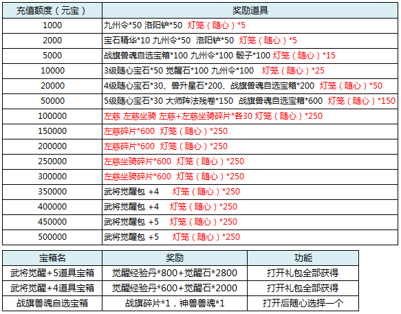 2、活动期间,充值达标即可领取对应奖励。具体对应档次奖励情况: