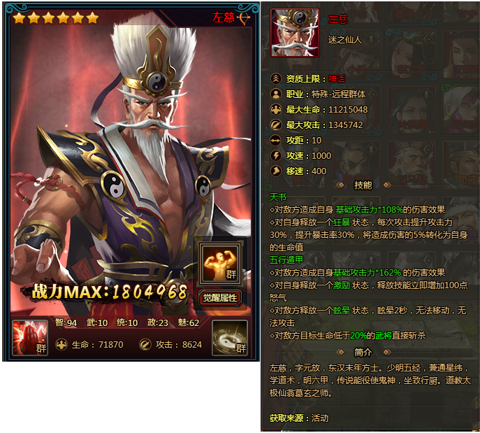 1、新增顶级特殊远程武将—左慈;