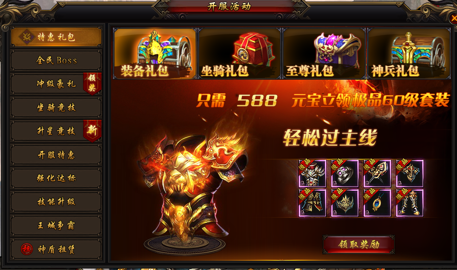 活动说明:活动期间所有玩家均可花费少量元宝领取超值特惠礼包,内涵极品装备,海量材料,让你在开服期间升级更迅速,打怪PK更轻松!