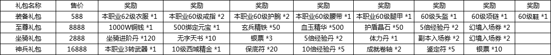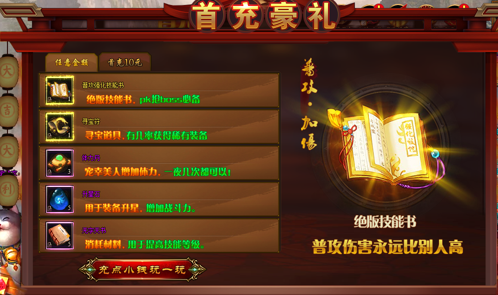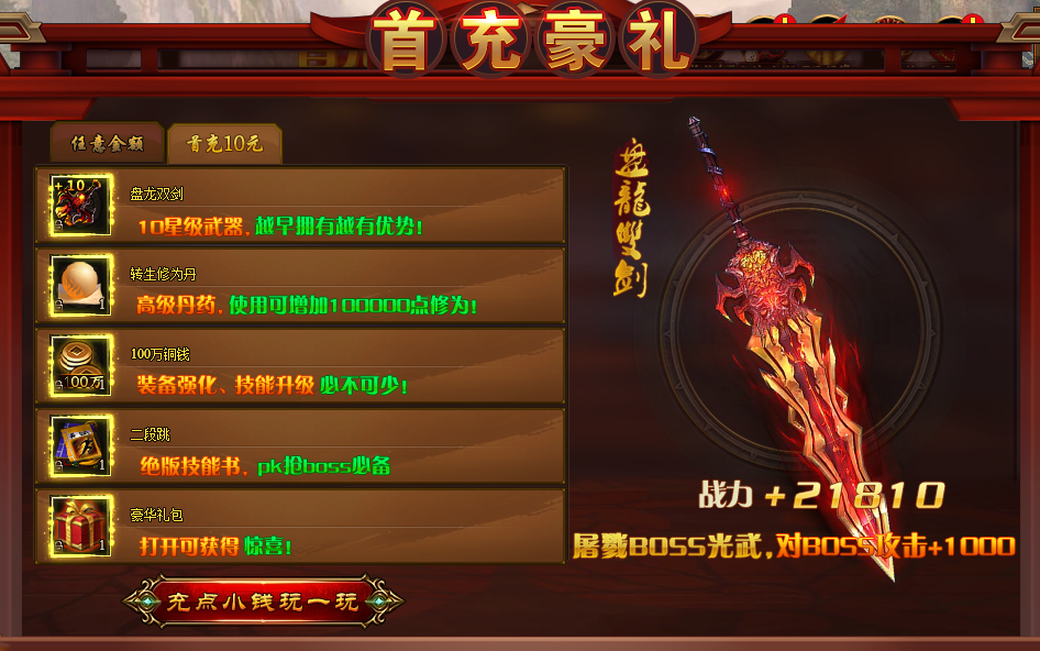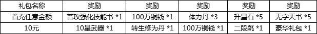 活动说明:活动期间,充值任意金额可获得绝版技能书、寻宝符,体力丹,升星石等,充值10元可获得10星级武器、转生修为丹、绝版技能书、豪华礼包等。