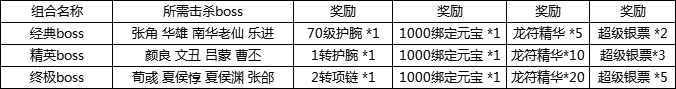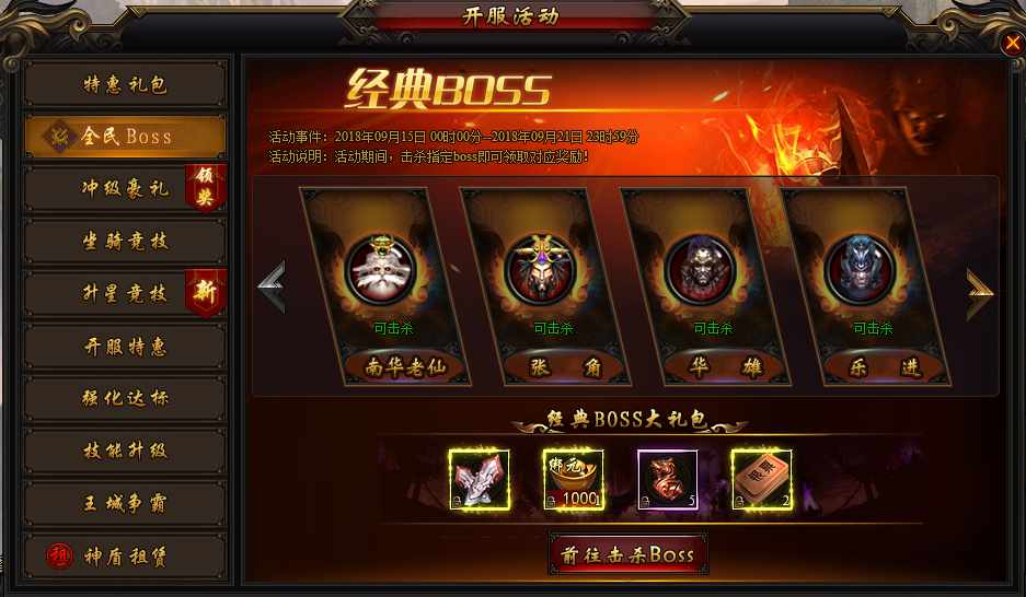 活动说明:活动期间所有玩家均可参加BOSS挑战活动,击杀BOSS除掉落装备道具外,更可领取海量奖励,赶快召集小伙伴一起挑战强力BOSS吧!