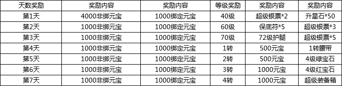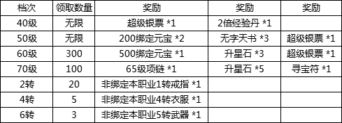 活动说明::活动期间,达到相应等级,即可领取超级银票、经验丹、升星石、绑定元宝、无字天书、寻宝符等材料,快来提升等级吧!