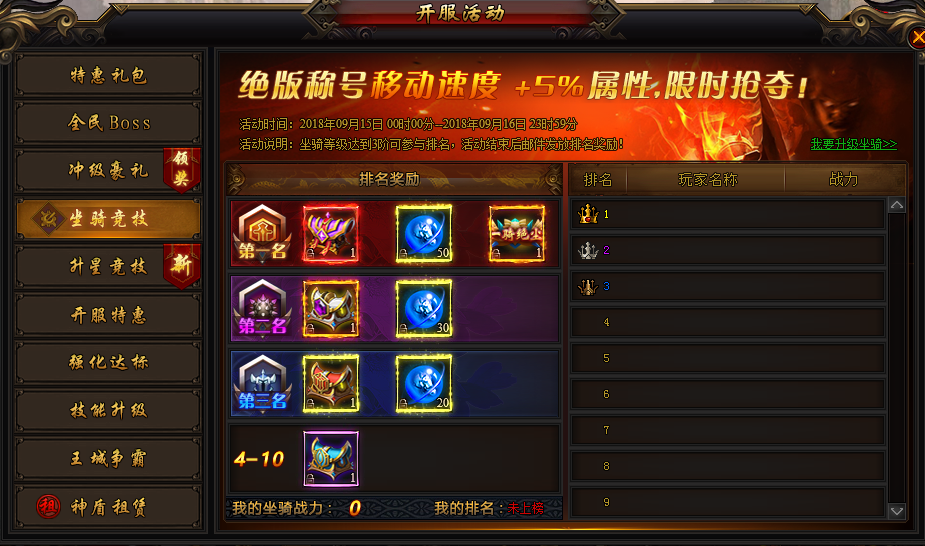 活动说明:坐骑等级达到3阶即可参与排名,排名可获得原石袋,高级坐骑丹,称号等。