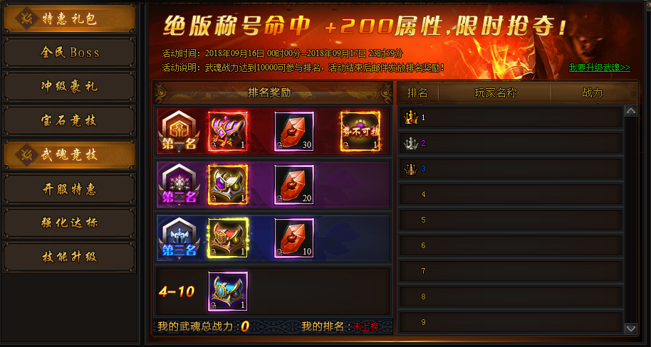 活动说明:武魂达到10000战力可参与排名,排名可获得丰厚奖励。
