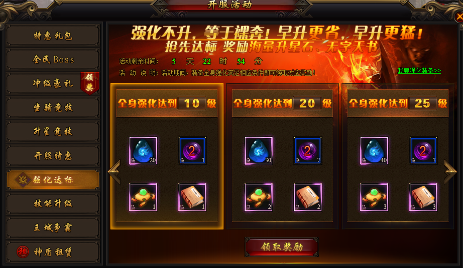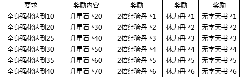 活动说明:活动期间,装备全身强化达到相应等级,即可领取升星石、经验丹、体力丹、无字天书,加油强化吧!