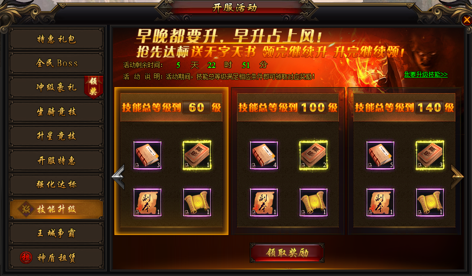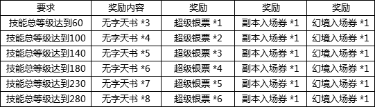 活动说明:活动期间,技能总等级达到相应等级,即可领取无字天书、超级银票、副本入场券、幻境入场券,抓紧提升吧!