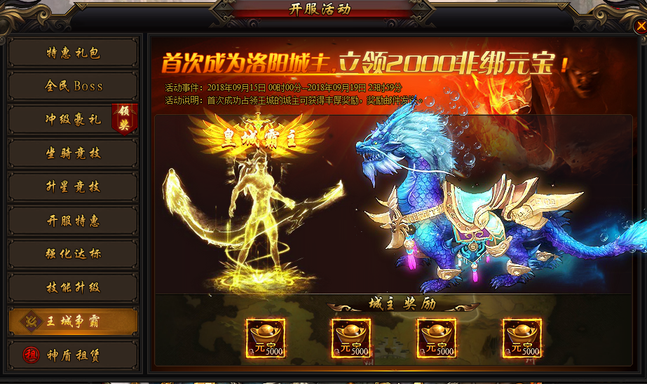 活动说明:活动期间,参与王城争霸活动可获得丰厚奖励,首次胜利的帮主可获得20000非绑定元宝,赶快参与争夺城主吧!