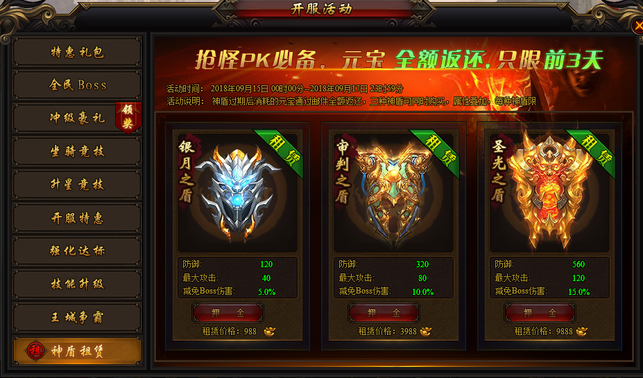 活动说明:活动期间,可通过租赁神盾提升属性,神盾过期后消耗的元宝通过邮件全额返还,还可以三种神盾同时购买,属性叠加哦。