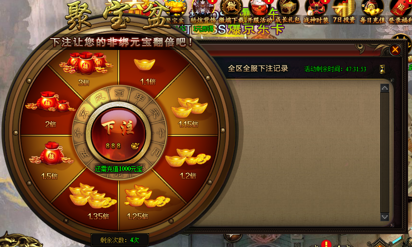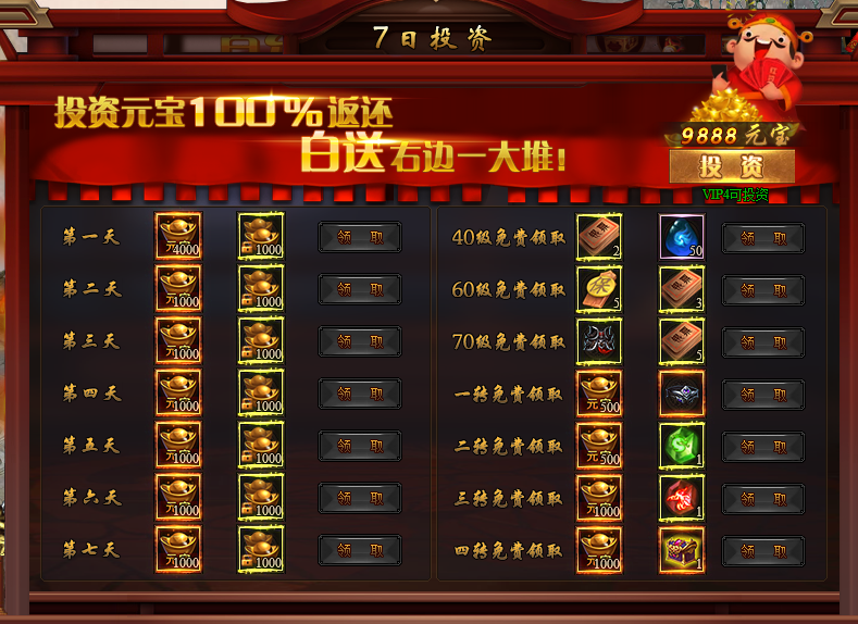 活动说明:投资元宝100%返还,稀有材料等你拿。