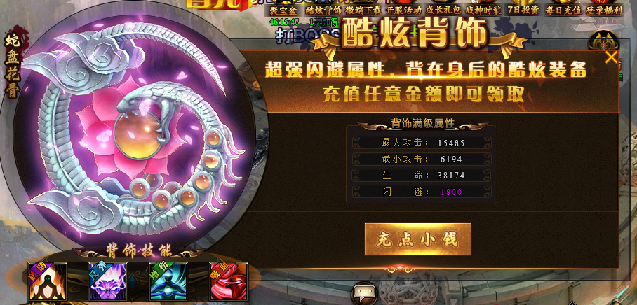 活动说明:活动期间,充值任意金额,可获得超强闪避属性的酷炫装备。