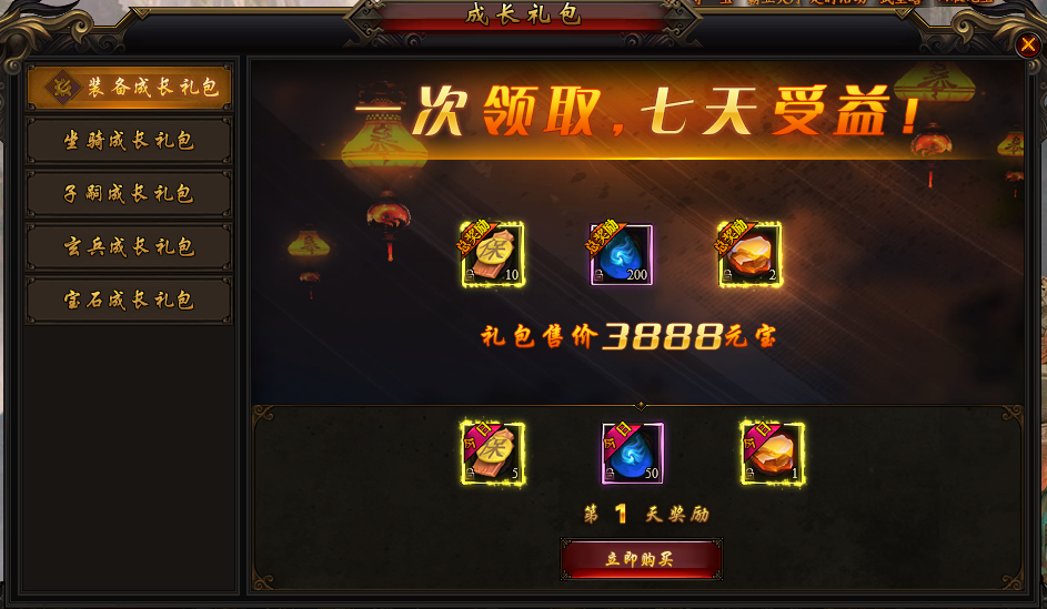 活动说明:活动期间,花费元宝购买成长礼包,一次领取,7天收益。