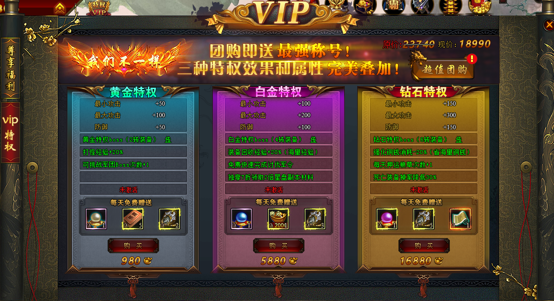 活动说明:VIP可无限传送,开启BOSS密室等福利,还有奖励可以拿。特权可提升属性,每天可免费领取经验球、超级银票、军工令等道具。