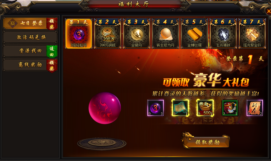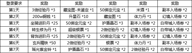 活动说明:活动期间,登录可游戏可领取奖励,连续7天奖励高。