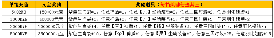 活动内容:活动期间,单服前20名单笔充值达到对应要求即可获得元宝奖励以及超值道具,切勿错过!