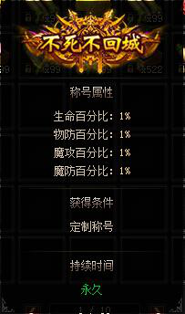 Ø 三、玩家累计充值(活动3天累计)达到50000RMB,可以自己选四至六个字-带特效定制称号,全属性增加4%。(定制称号在活动结束后统一提交制作,延后发放;活动期间,每个玩家仅能定制一个4%称号)