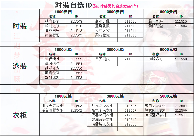 6、5000:仙将礼包*100(高级时装自选*1 或 初+中级时装自选组合)