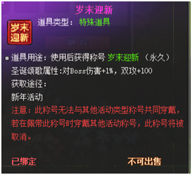 活动期间内(2月12日当天)充值指定金额:100元的大侠都能获得额外双倍钻石+岁末迎新称号*1(每个账号仅限一次,联系客服领取)。